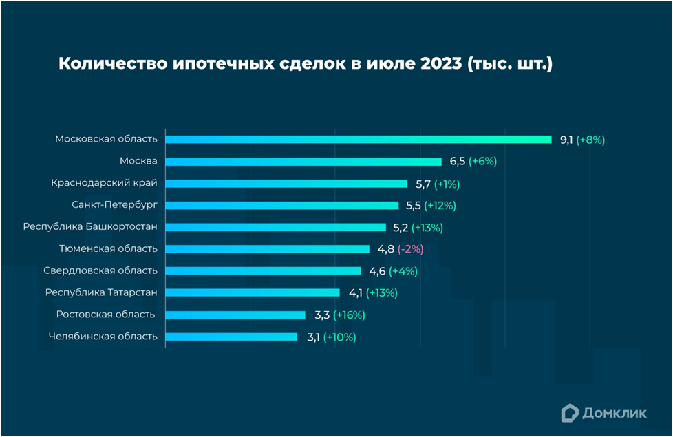 Топ-10 регионов РФ по количеству выдач ипотеки Сбера в июле 2023. Процентный прирост по отношению к июню 2023 для каждого региона показан в скобках. Данные Домклик.