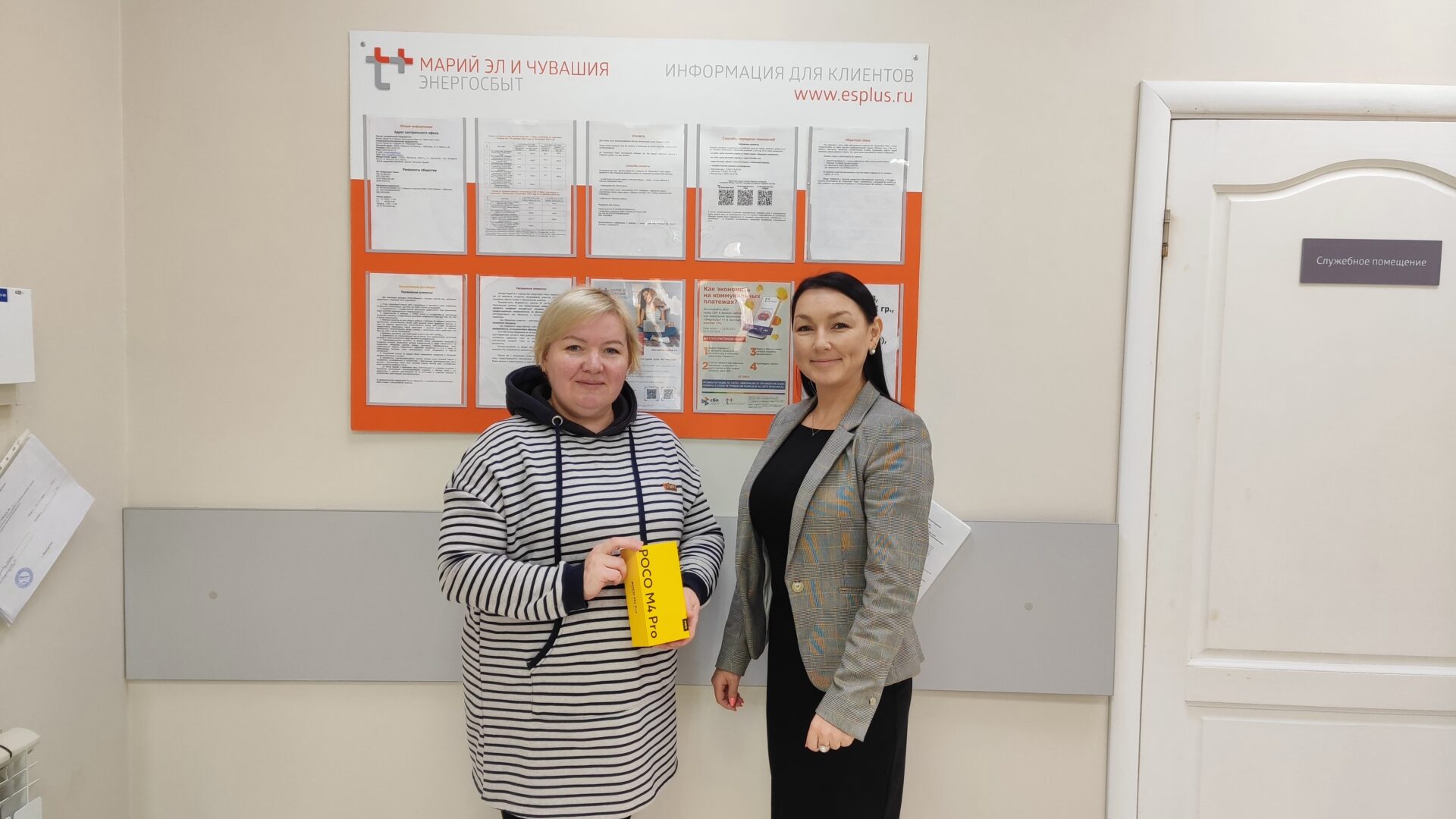 Филиал Марий Эл и Чувашии «ЭнергосбыТ Плюс» наградил победителя второго этапа акции «Офис в кармане» в Йошкар-Оле. Руководитель офиса продаж и обслуживания клиентов Елена Алексеева вручила смартфон клиентке, которая оформила подписку на электронную квитанцию за тепло и горячую воду.