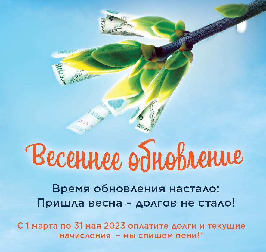 По ее условиям клиенты – физические лица с 1 марта по 31 мая 2023 года могут избавиться от начисленных пеней* при единовременной оплате задолженности и текущих начислений на дату платежа.