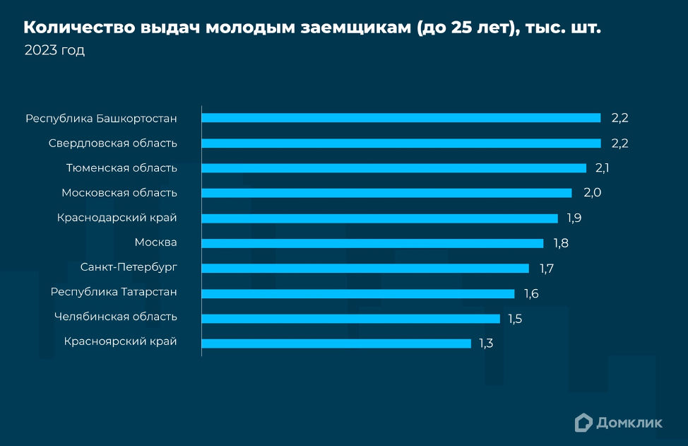 По количеству ипотечных сделок, заключенных молодёжью в 2023 году, столичные субъекты не попали в тройку лидеров: рейтинг возглавили Республика Башкортостан и Свердловская область (по 2,2 тыс. сделок), а также Тюменская область (2,1 тыс.). Московская область — на четвёртом месте, Москва и Санкт-Петербург — на шестом и седьмом соответственно.
