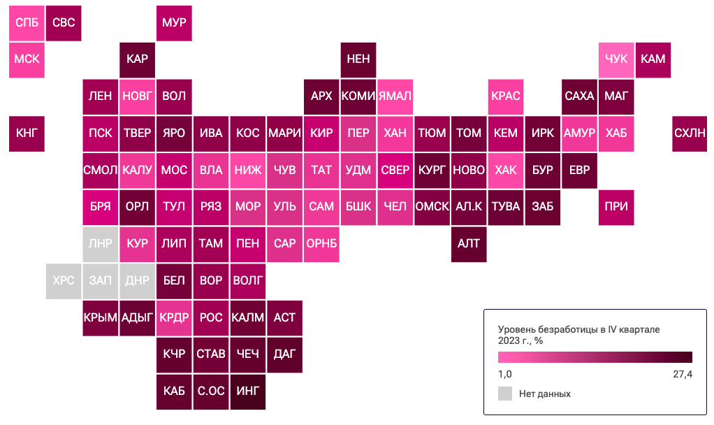 В четвертом квартале прошлого года уровень безработицы в республике составил три процента, а изменение этого показателя по сравнению с аналогичным периодом 2022 года составило -0,4 п.п.