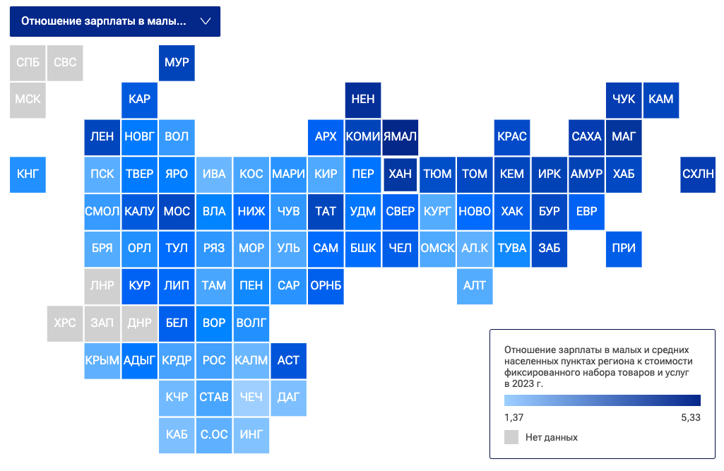 В нашей республике отношение зарплаты в малых и средних населенных пунктах к стоимости фиксированного набора товаров и услуг в прошлом году составляет 2,23. Средний уровень заработка — 41,2 тысяча рублей, а прирост зарплаты в 2023 году составил 19,8%.