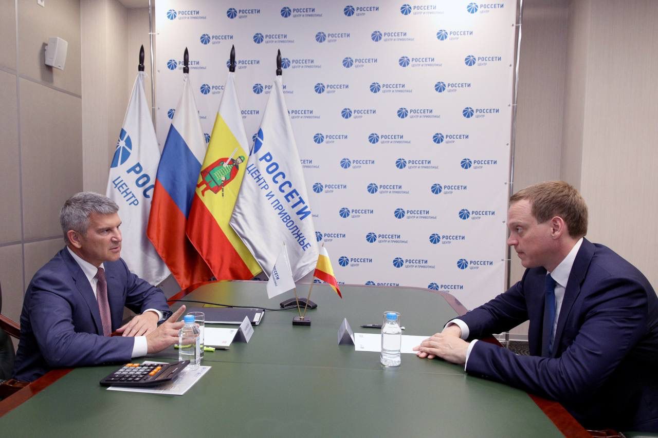 Губернатор Рязанской области Павел Малков и генеральный директор ПАО «Россети Центр» – управляющей организации ПАО «Россети Центр и Приволжье» Игорь Маковский на площадке 10-й профессиональной Коллегии Обществ провели ра