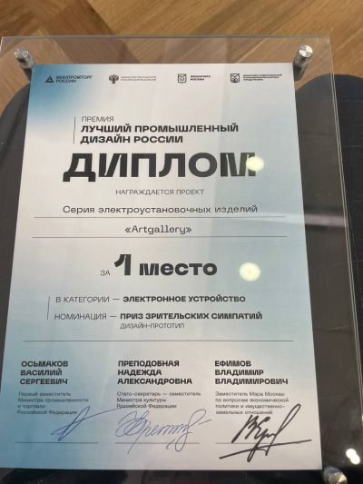 В Москве определили победителей в финале премии «Лучший промышленный дизайн России». Новая серия электроустановочных изделий ArtGallery, которую будут производить на заводе «Потенциал» (компания «Систэм Электрик»), заняла 1 место в категории «Электронное устройство» в номинации «Приз зрительских симпатий».