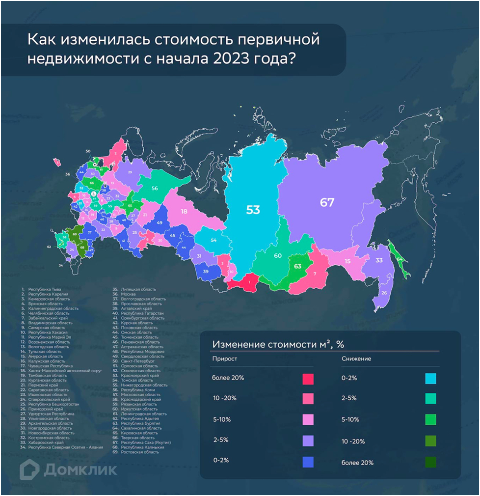 Сравнение данных за январь и июнь 2023 года показало, что в большинстве регионов стоимость квадратного метра в новостройках незначительно увеличилась — в пределах 5%.