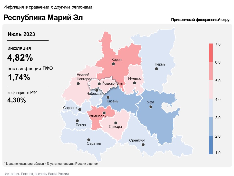 В июле 2023 года годовая инфляция в Марий Эл ускорилась до 4,82%