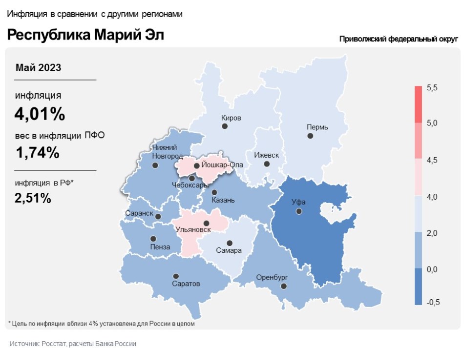 Годовая инфляция в Республике Марий Эл в мае 2023 года составила 4,01% после 3,70% в апреле. На ускорение инфляции в регионе повлияли сокращение предложения отдельных продуктов, рост спроса на туристические услуги, а также произошедшее ранее ослабление рубля. Сказался и статистический эффект низкой базы. В то же время значение региональной инфляции сохранилось выше показателей по Приволжскому федеральному округу (1,80%) и в целом по России (2,51%).