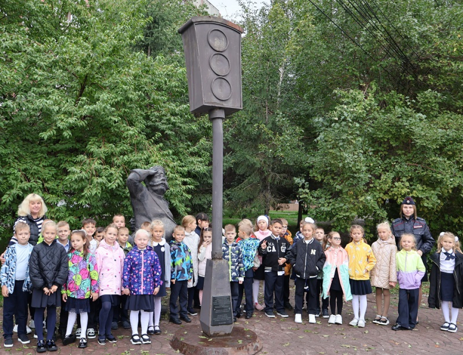 Ученики 1 «Б» класса МБОУ «Лицей № 12» приняли участие в необычном мероприятии. Сначала детям напомнили, как правильно переходить проезжую часть дороги, обсудили с ними особенности перехода проезжей части по регулируемому и нерегулируемому пешеходным переходам, провели викторину на знание дорожных знаков и сигналов светофора. Далее ребята, в сопровождении дорожного полицейского и сотрудника аппарата детского омбудсмена, на практике отработали навыки правил безопасного перехода проезжей части, дружно пройдя путь к первому установленному в России памятнику светофору, расположенному вблизи лицея. Здесь первоклашки узнали, что место для памятника светофору новосибирцы выбрали неслучайно. Именно здесь в 1940-х годах был установлен один из первых светофоров в городе. Кстати, в то время светофоры были с ручным переключением. Тогда их в первую очередь размещали около школ, чтобы обезопасить учеников. Памятник представляет собой постового, который приветствует светофор. Открытие памятника было приурочено к 70-летию со дня образования ГИБДД. Теперь это одна из любимых достопримечательностей местных жителей и туристов — с памятником светофору фотографируются и взрослые, и дети. Одновременно памятник напоминает всем участникам дорожного движения о необходимости соблюдения правил.