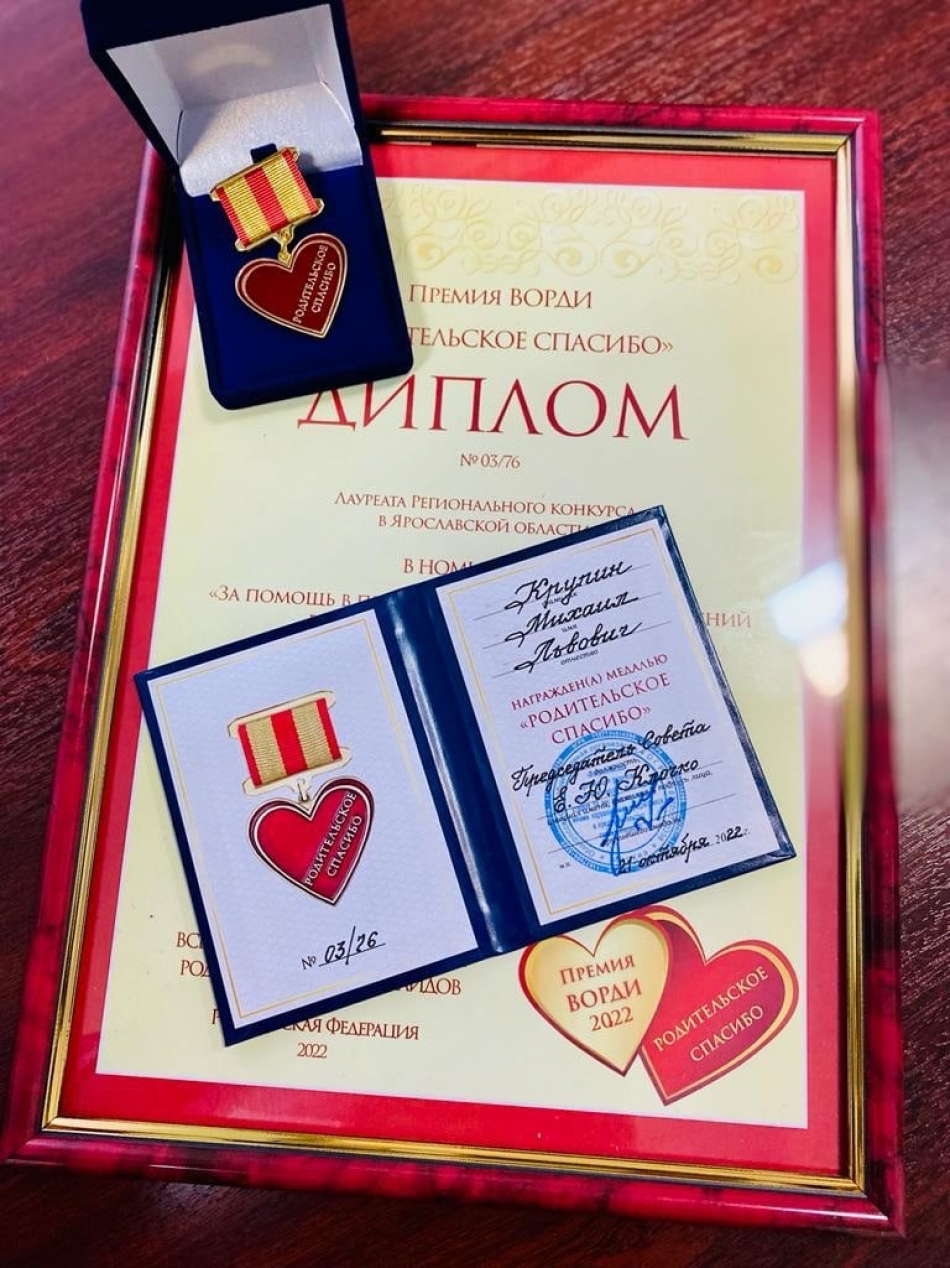 5 апреля на Общественном совете при Уполномоченном по правам ребенка Пейпонен Наталья Валерьевна - председатель Всероссийской организации родителей детей-инвалидов - наградила Михаила Крупина медалью премии «Родительское спасибо».