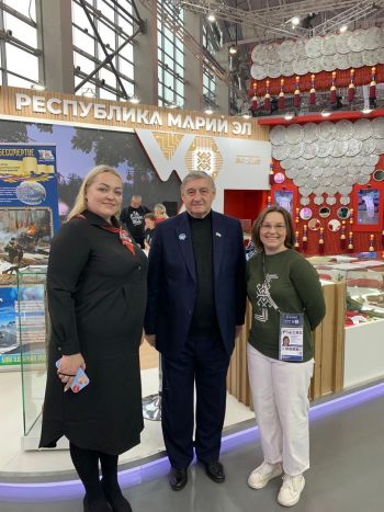 Глава марийского парламента пообщался с сотрудником Национального музея имени Т. Евсеева Ксенией Белынцевой и начальником штаба Йошкар-Олинского местного отделения движения “Юнармия” имени Героя России Дамира Шаймарданова Оксаной Белорусовой, а также с волонтерами, работающими на выставке.