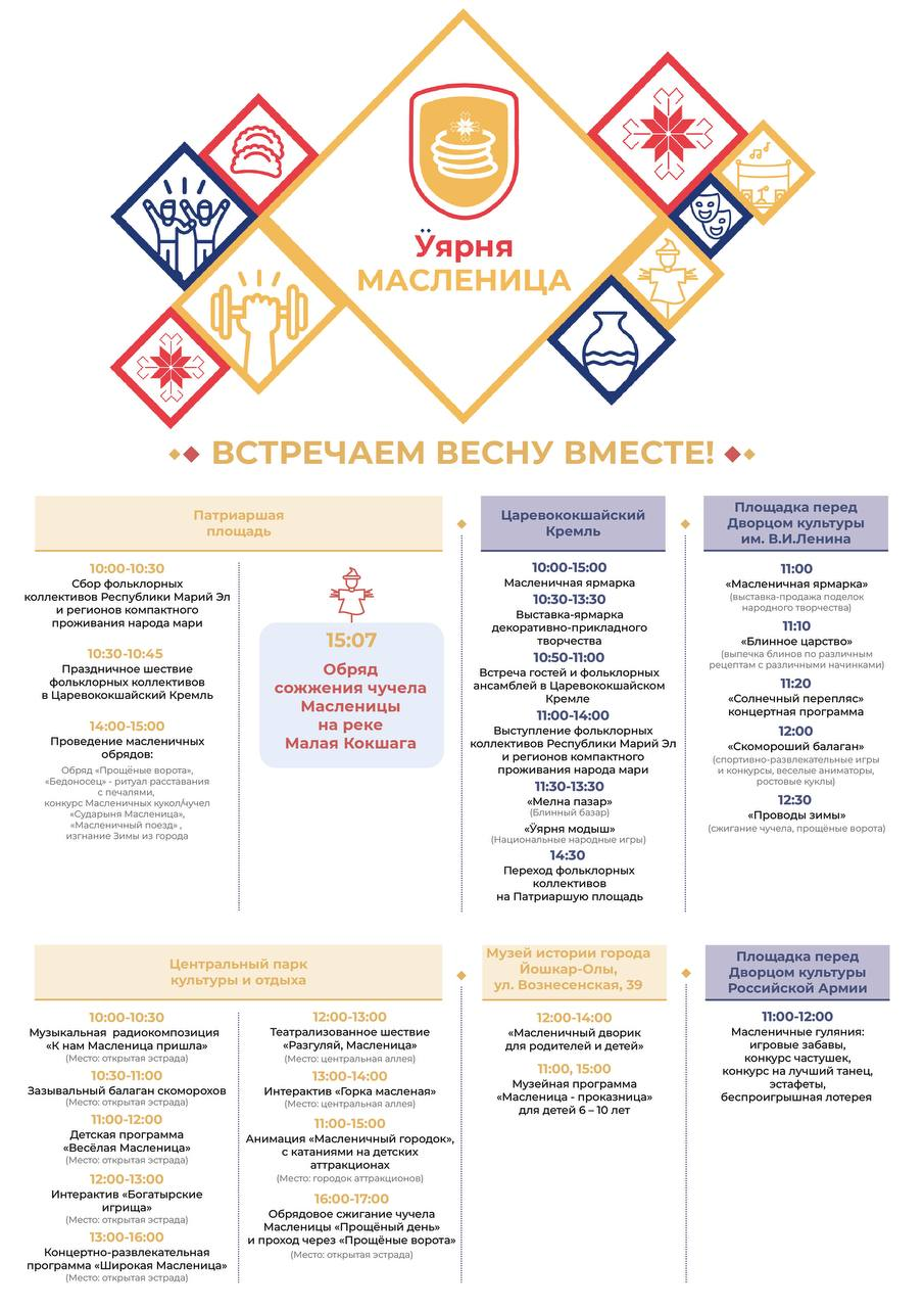 Широкое празднование масленицы намечено в столице Марий Эл, мероприятия пройдут на шести различных площадках.