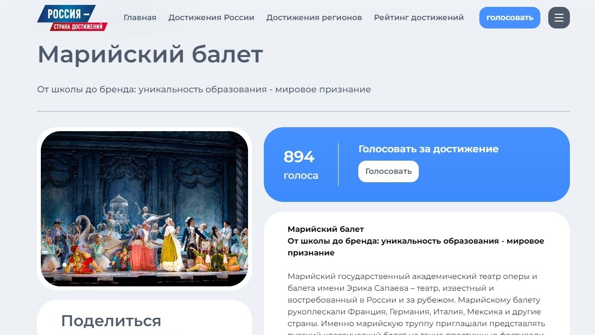 Теперь в этом разделе стало на одно достижение больше. Гордостью нашей республики является балет. Теперь его можно выбрать из 11 вариантов для голосования на портале «Достижения.рф».