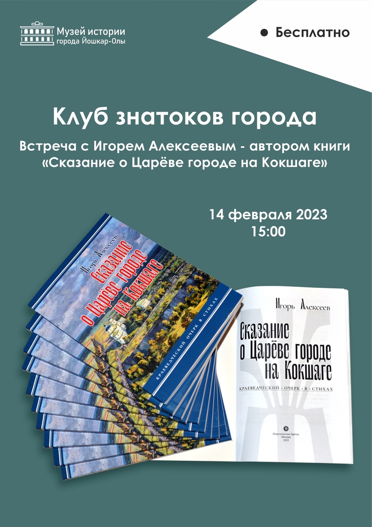 14 февраля 2023 года в 15 часов в Музее истории Йошкар-Олы состоится презентация краеведческого очерка в стихах «Сказание о Царёве городе на Кокшаге». Книгу представит автор – Игорь Алексеев, член Союза литераторов России, Союза писателей Москвы и Союза краеведов России, лауреат многих конкурсов и фестивалей.