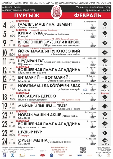 Репертуар театров и филармонии Йошкар-Олы на февраль 2023 года.