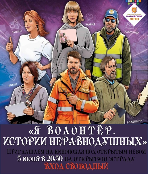 А уличный кинотеатр Центрального парка культуры и отдыха приглашает 3 июня в 20:30 на открытую эстраду на кинопоказ фильма " #Яволонтер . Истории неравнодушных", в рамках Всероссийского баркемпа #ПРОДОБРО2023 и фестиваля "Марийское лето".