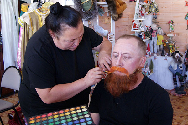 В организации спектакля в той или иной степени приняли участие более десятка человек. Это не только актеры, которые выходили с монологами на подмостки, но и декораторы, оформлявшие сцену, и бутафоры, благодаря которым у Бабы-Яги появилась настоящая ступа, и художник по костюмам, потративший немало свободного времени на маску для ростовой куклы сказочного Оленя. В тех случаях, когда любительским энтузиазмом было не обойтись, на помощь пришел профессионал – гример-постижер Марийского государственного академического театра оперы и балета имени Э.Сапаева Елена Филимонова. Именно благодаря ей постановка обрела свое лицо, причем, в самом буквальном смысле.