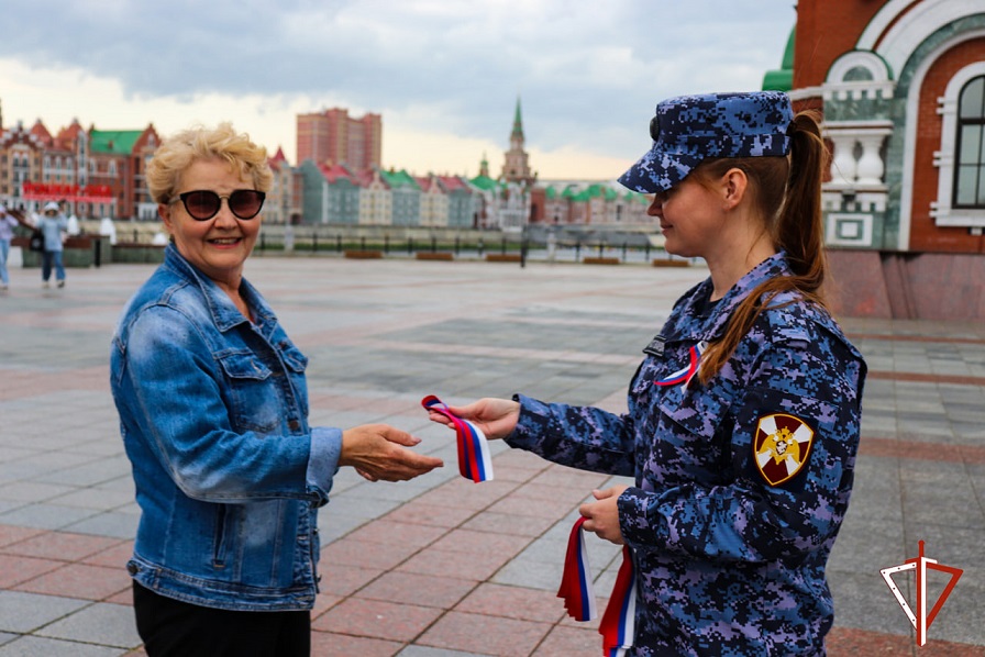 На улицах г. Йошкар-Ола росгвардейцы провели всероссийскую акцию по распространению ленточек в цветах флага России «Российский триколор».