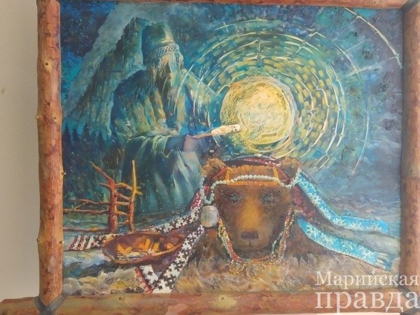 Следующий этап его творчества «югорский», вернее, финно-угорский, потому что марийский этнос не ушел даже из картин, основанных на преданиях народов севера. К примеру, на картине «Праздник медведя», написанной в 2002 году по преданию народа ханты, посетители выставки могут увидеть и марийские символы. Меня лично впечатлила великолепная картина этнофутуриста «Вороний день».