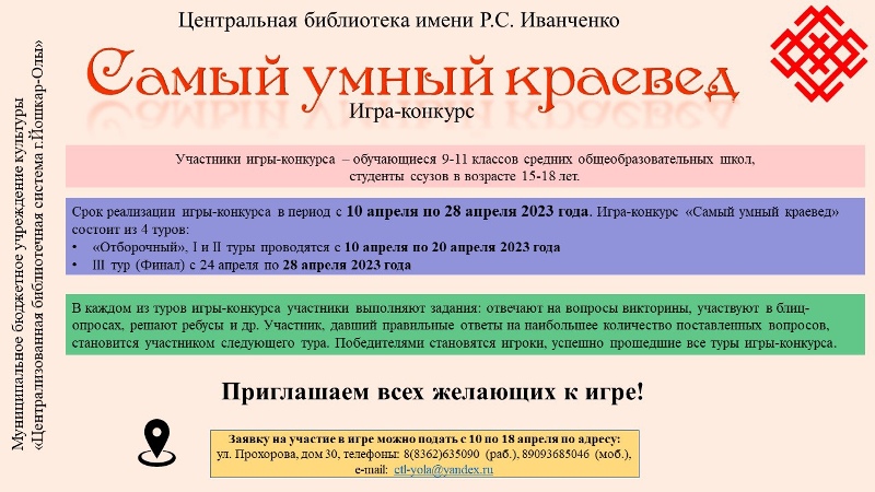 С 10 апреля по 28 апреля Центральная библиотека имени Р.С. Иванченко МБУК «Централизованная библиотечная система г. Йошкар-Олы» проводит игру-конкурс «Самый умный краевед».