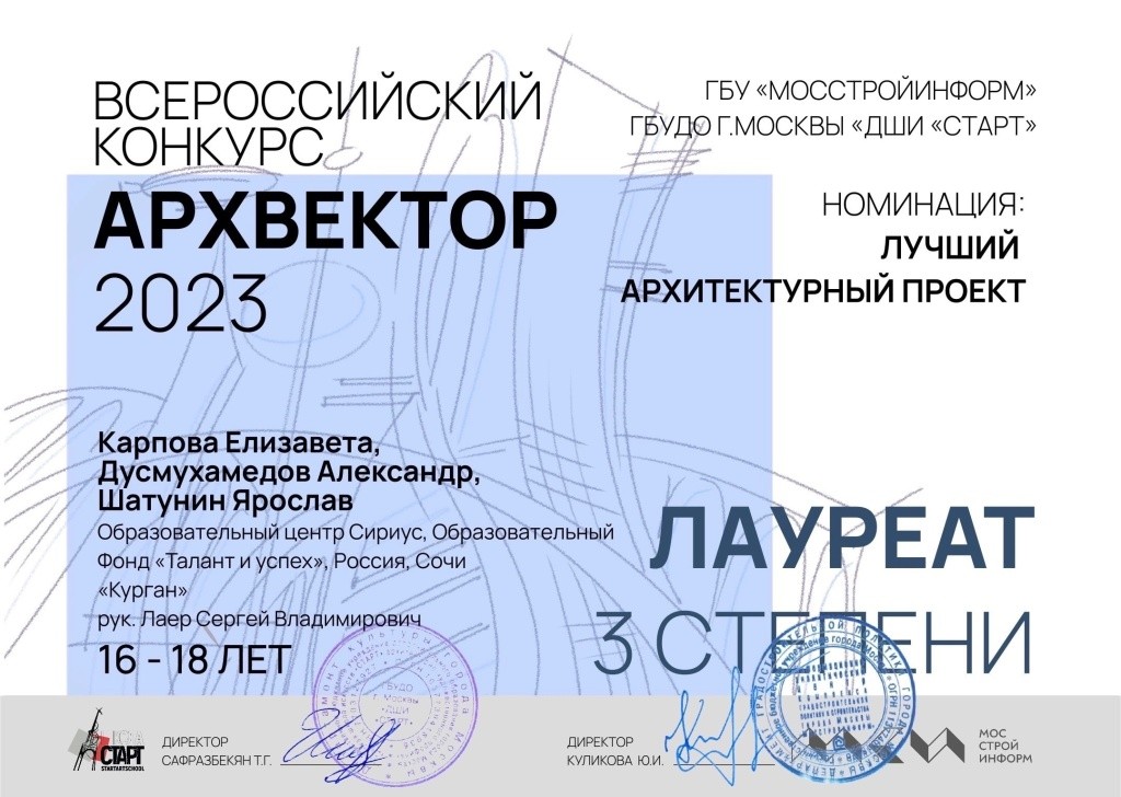 В конкурсе «АрхВектор – 2023» участвовало более 500 работ из 35 городов РФ. Это самый крупный профессиональный конкурс для детей и подростков в России. «Лиза [Карпова] каждый раз поражает нас своими успехами, ну а мы желаем ей удачи и дальнейших успехов!», – говорится в поздравлении от имени преподавателей и директора школы №4 в соцсети «ВКонтакте». Кстати, в июне Елизавета становилась победителем Всероссийского конкурса «Идеи, преображающие города» от международной выставки «АрхМосква». Ее архитектурный проект занял первое место в номинации «Проекты и планы городского развития».