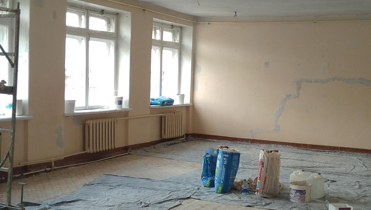 Сейчас рабочие ремонтируют санузел для мальчиков на втором этаже, красят стены и плунтусы в классных кабинетах.