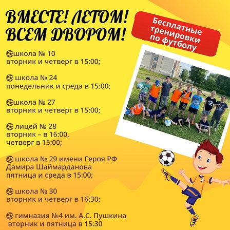 ⚽ школа № 29 имени Героя РФ Дамира Шаймарданова – пятница и среда в 15:00;