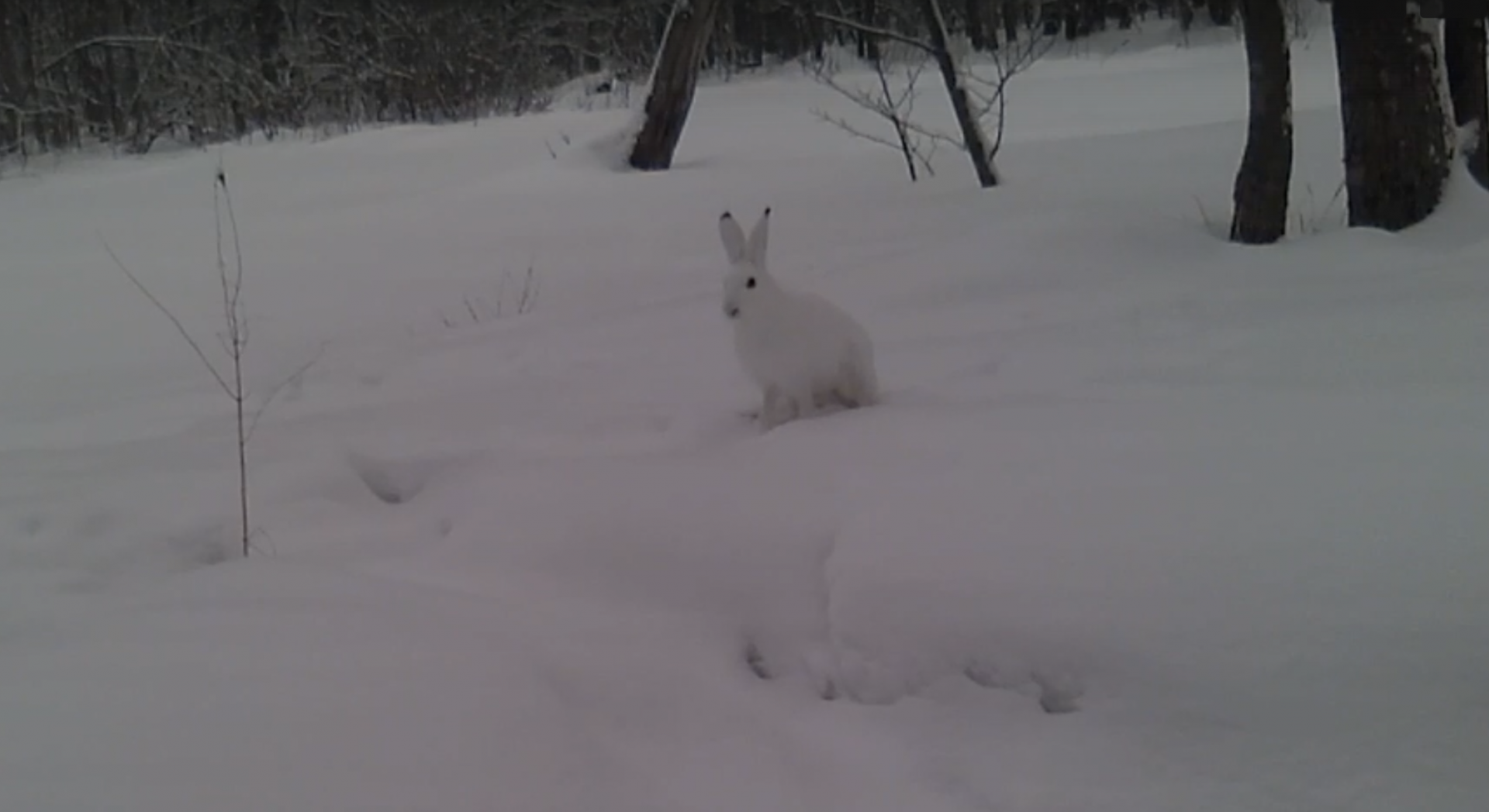 Вечером пятого марта мимо фотоловушки пробежала куница. Заметив объектив камеры, животное убежало. На следующее утро попозировать для любителей природы прискакал заяц-беляк.