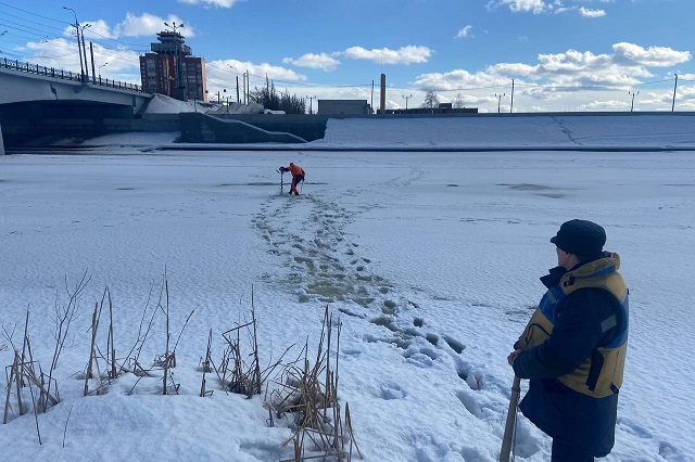 Спасатели Марийской аварийно-спасательной службы проводят замеры толщины льда на водоемах республики.