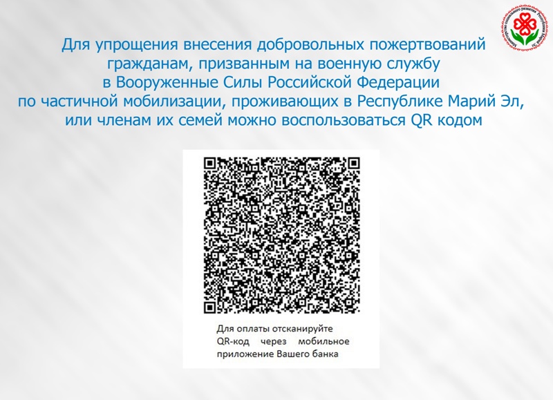 Для упрощения внесения денежных средств гражданам, призванным на военную службу в Вооруженные Силы Российской Федерации по частичной мобилизации, проживающих в Республике Марий Эл, или членам их семей можно воспользоваться QR кодом.
