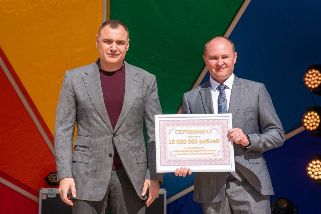 Глава региона поздравил жителей и гостей с юбилеем и вручил мэру Козьмодемьянска Михаилу Козлову сертификат номиналом 10 миллионов рублей на приобретение комбинированной дорожной машины и светотехнического оборудования для города.
