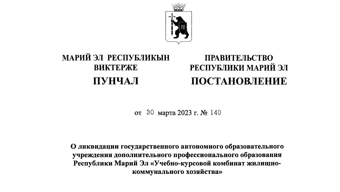 В Правительстве Марий Эл подписано постановление № 140 «О ликвидации государственного автономного образовательного учреждения дополнительного профессионального образования РМЭ «Учебно-курсовой комбинат жилищно-коммунальн
