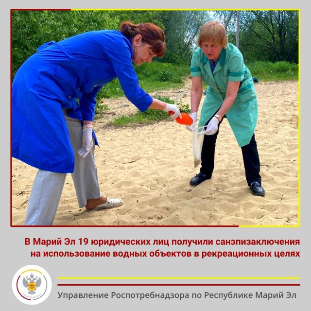 Согласно информации ФБУЗ «Центр гигиены и эпидемиологии в республике Марий Эл» по состоянию на 19 июня в работе находятся материалы для проведения лабораторных исследований качества воды поверхностных водоёмов, почвы/песка в местах рекреации на соответствие гигиеническим нормативам по санитарно-химическим, микробиологическим, паразитологическим показателям и дальнейшего оформления санитарно-эпидемиологических заключений для 11 юридических лиц: ООО «Российская железная дорога» (озеро Яльчик), Юринской городской администрации (пляж п. Юрино, р. Волга), ООО «База отдыха «Яльчик», ФГБОУ ВО «Поволжский государственный технический университет» (СОЛ «Политехник», озеро Яльчик), ИП Ласточкина А.М. (пляж ДЛО «Большая медведица», Оршанский район, д. Керды), Советской городской администрации Советского района (пляж р. Ронга), ГБУ Республики Марий Эл «Волжская центральная городская больница» (пляж оз. Кичиер), Звениговской городской администрации Звениговского района (база отдыха «Звениговская», р. Волга), Салтакьяльской сельской администрации Куженерского района (река Визимка), Новоторъяльской городской администрации Новоторъяльского района (река Шукшан), Чендемеровской сельской администрации Сернурского района (д. Захарово, река Она).