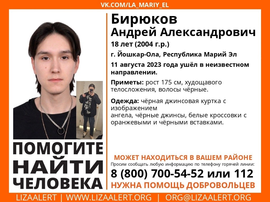 В Йошкар-Оле отряд «ЛизаАлерт» разыскивает подростка Андрея Бирюкова. Основные приметы: рост 175 сантиметров, худощавого телосложения, черные волосы. Был одет в черную джинсовую куртку с изображением ангела, черные джинсы, белые кроссовки с оранжево-черными вставками.