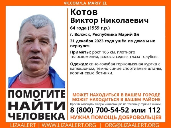 В Волжске разыскивают пропавшего Виктора Николаевича Котова, об этом сообщили в поисково-спасательном отряде "ЛизаАлерт" Марий Эл.