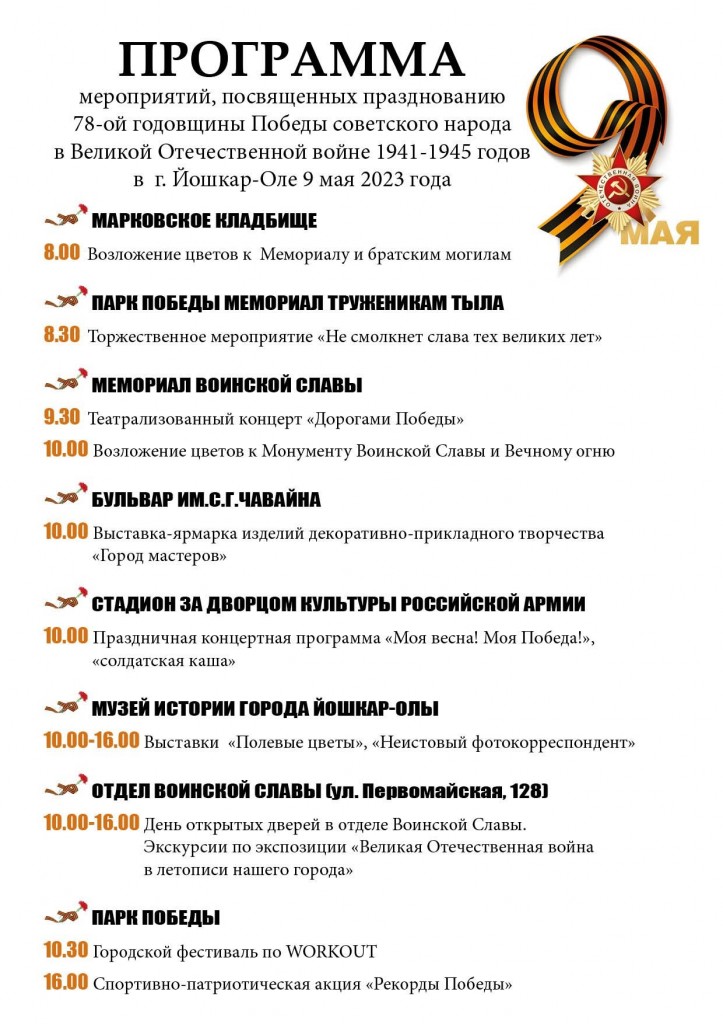 Горожане и гости Йошкар-Олы! Приглашаем вас посетить мероприятия, посвященные Дню Великой Победы.