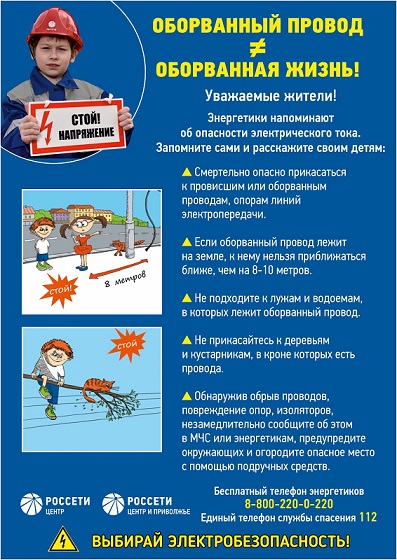 При обнаружении обрыва проводов, искрения, повреждения опор, изоляторов, незакрытых или поврежденных дверей трансформаторных подстанций или электрических щитов необходимо незамедлительно сообщить об этом по бесплатному круглосуточному телефону контакт-центра компании «Россети» 8-800-220-0-220 (телефон бесплатный и круглосуточный).