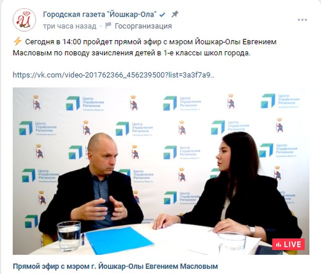 Сегодня проходит прямой эфир с мэром Йошкар-Олы Евгением Масловым по поводу зачисления детей в 1-е классы школ города. Горожане могут задать свои вопросы градоначальнику в прямом эфире. Ответы будут озвучены в ходе трансляции. Ссылка на эфир