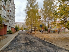 Сотрудники подрядной организации уложили первый выравнивающий слой асфальтобетонного покрытия. На этой неделе продолжаются работы по укладке финишного слоя покрытия. Также по просьбам жителей этих домов были увеличены парковки для автомобильного транспорта.