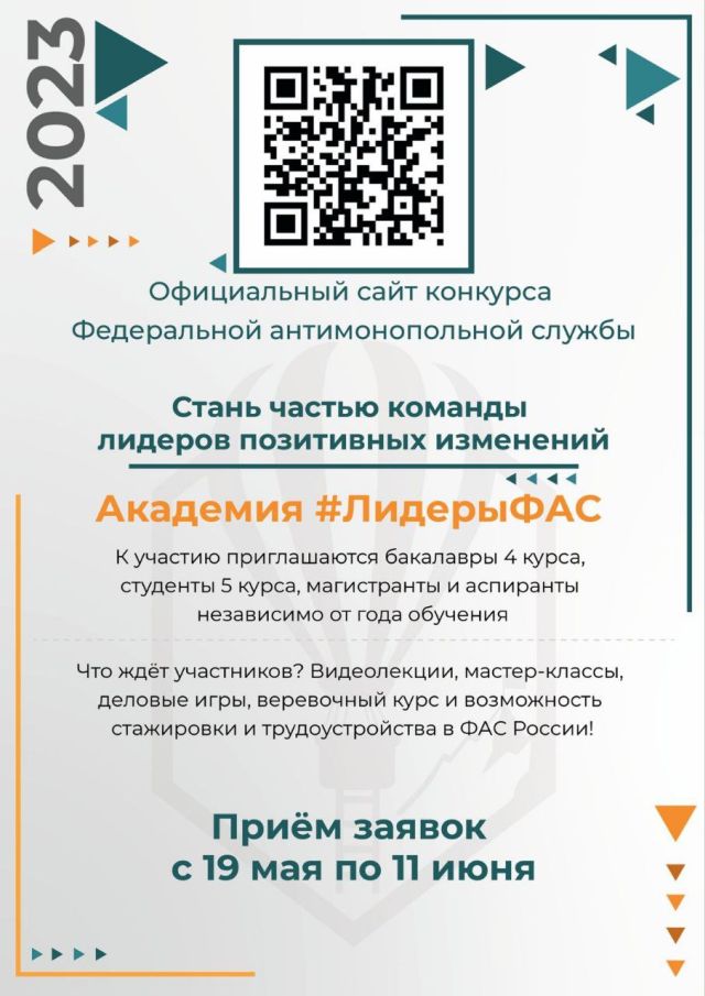 Приглашаем к участию студентов вузов Республики Марий Эл, обучающихся по программам бакалавриата 4 курса обучения, по программам специалитета 5 курса обучения, по программам магистратуры и аспирантуры вне зависимости от года обучения на момент регистрации в проекте Академия #ЛидерыФАС.