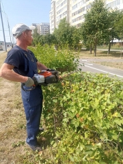 Сегодня рабочие-озеленители занимались прополкой цветников и уборкой скошенной травы на площади Ленина, на улице Кирова проводили стрижку кустарников.