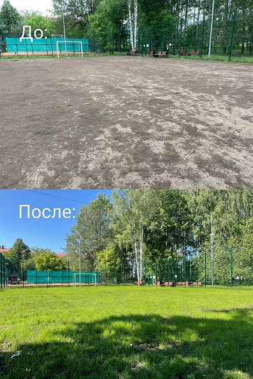 Работа состояла из основных этапов: культивация, посев семян спортивного газона и полива. Так же заменены сломанные в процессе эксплуатации секции забора.