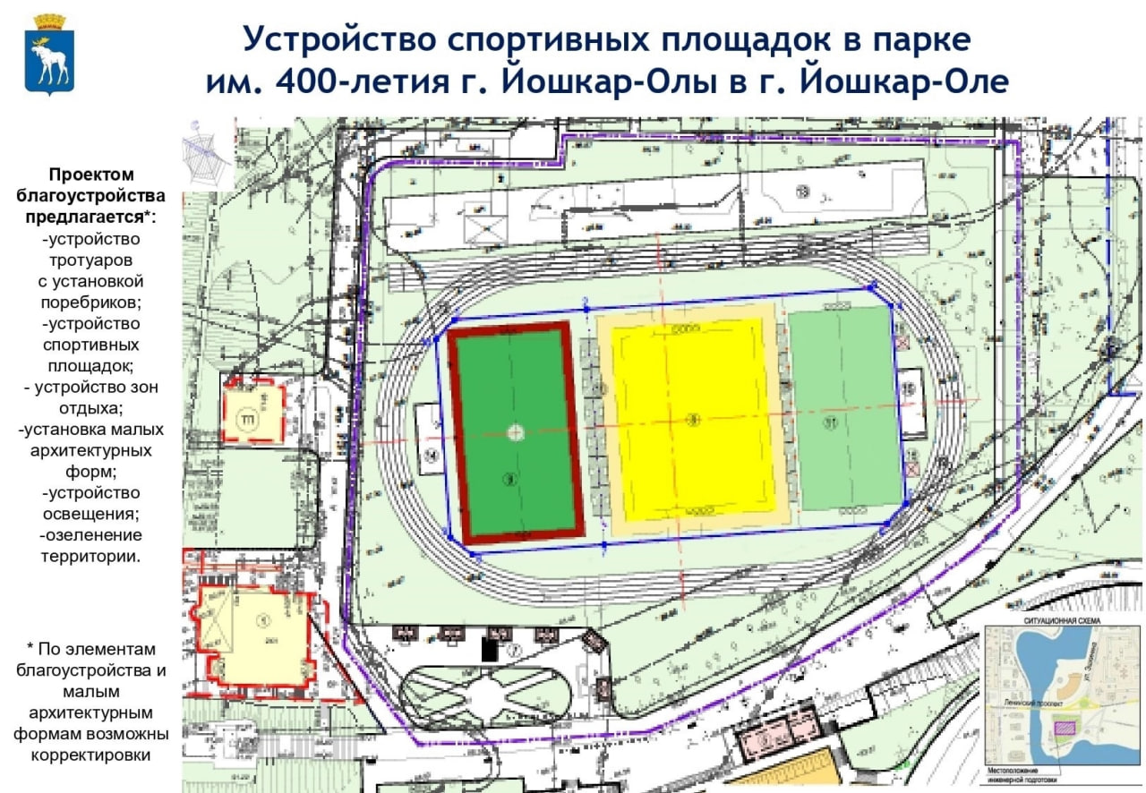 Претендентами на благоустройство являются 9 общественных территорий. Среди них проект устройства спортивных площадок в парке им. 400-летия Йошкар-Олы (около Центрального пляжа).