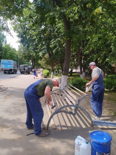 Рабочие строительного участка проводят ремонт и покраску скамеек на улице Пушкина, а так же ремонт тротуарной брусчатки на улице Первомайской.