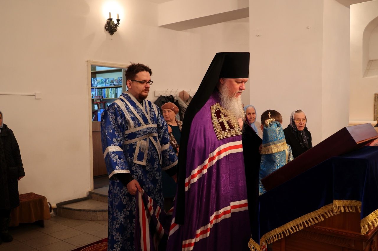 Его Преосвященству сослужили настоятель храма иконы Божией Матери «Всех скорбящих Радость» протоиерей Александр Михайлов и клирик Никольского кафедрального собора диакон Иоанн Захаров. Песнопения исполнял хор храма под управлением Ирины Канашиной.