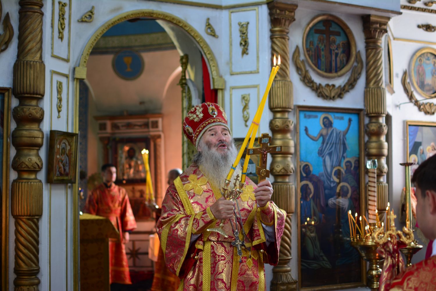 Владыке сослужили настоятель храма игумен Никодим (Актанаев), настоятель храма Вознесения с. Пертнуры иерей Роман Соловьев и протодиакон Михаил Козловский. Песнопения исполнял сводный хор под управлением Ангелины Соловьевой.