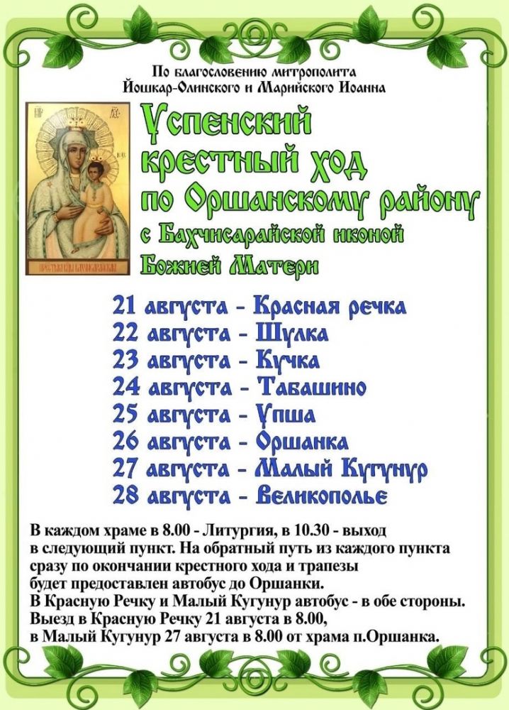 По благословению митрополита Йошкар-Олинского и Марийского Иоанна 21-28 августа в Оршанском районе состоится традиционный 110-километровый Успенский крестный ход. В этом году он пройдет с иконой Божией Матери «Бахчисарайская».