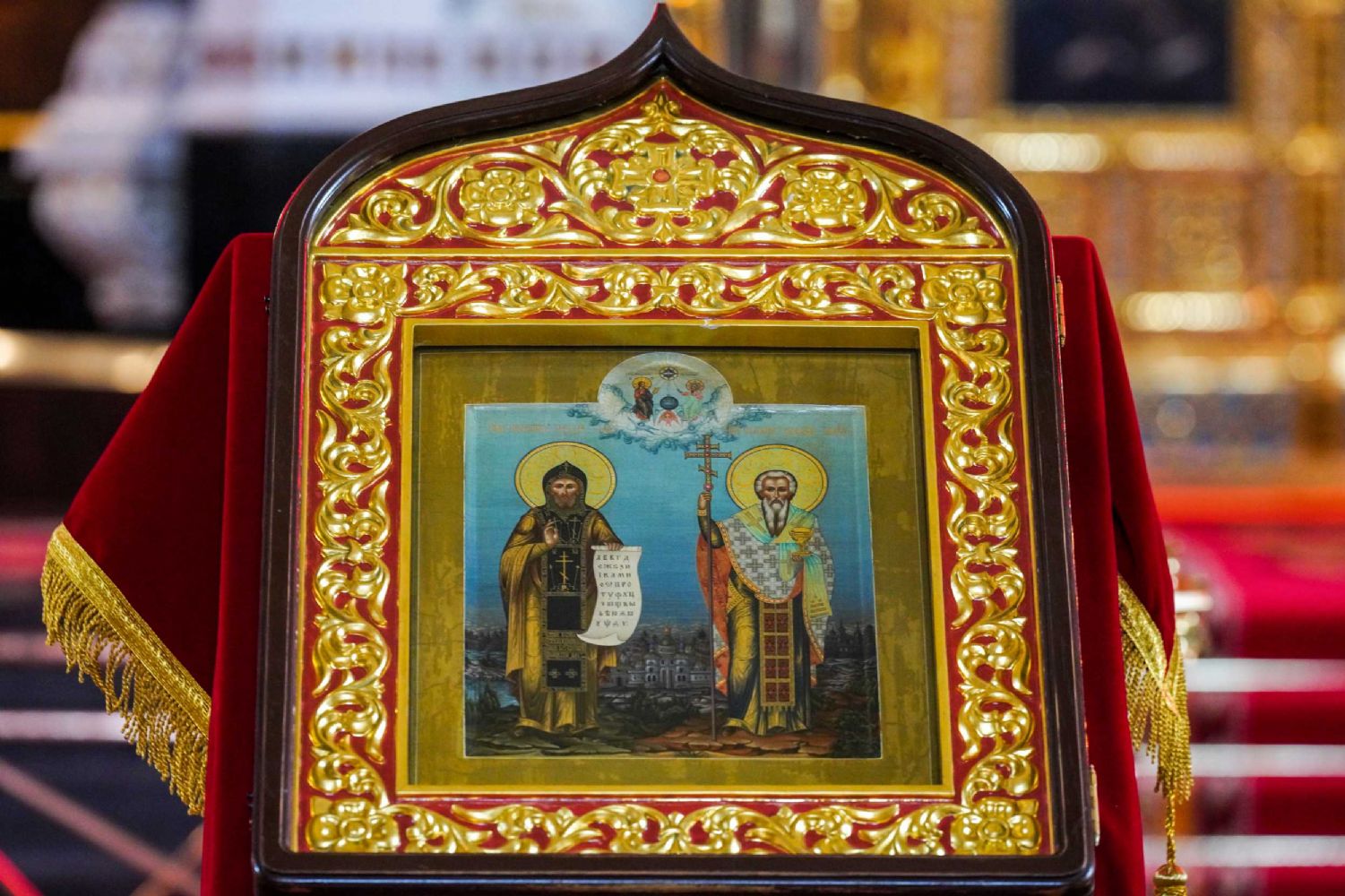 По окончании Литургии было совершено славление равноапостольным Мефодию и Кириллу, Святейший Владыка прочитал молитву.