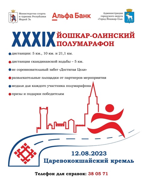 12 августа в столице Республики Марий Эл состоится XXXIХ Йошкар-Олинский полумарафон, посвященный Дню города и Дню физкультурника!