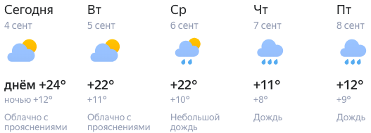 Во вторник синоптики обещают переменную облачность и +22 градуса, в среду ожидается аналогичная температура, но будет небольшой дождь. В четверг и пятницу будет пасмурно, резко похолодает до +12 градусов и в течение всего дня местами будет идти дождь.
