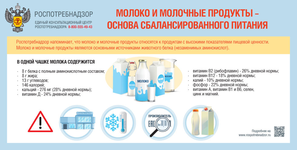 Роспотребнадзор напоминает, что молоко и молочные продукты относятся к продуктам с высокими показателями пищевой ценности. Они содержат значительное количество незаменимых нутриентов, обладают высокой переваримостью и усвояемостью. В питании молоко и молочные продукты являются основными источниками животного белка (незаменимых аминокислот).